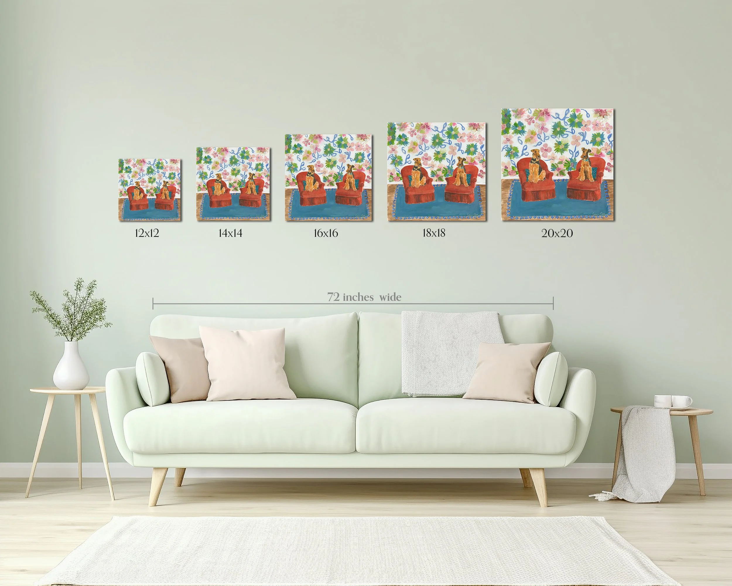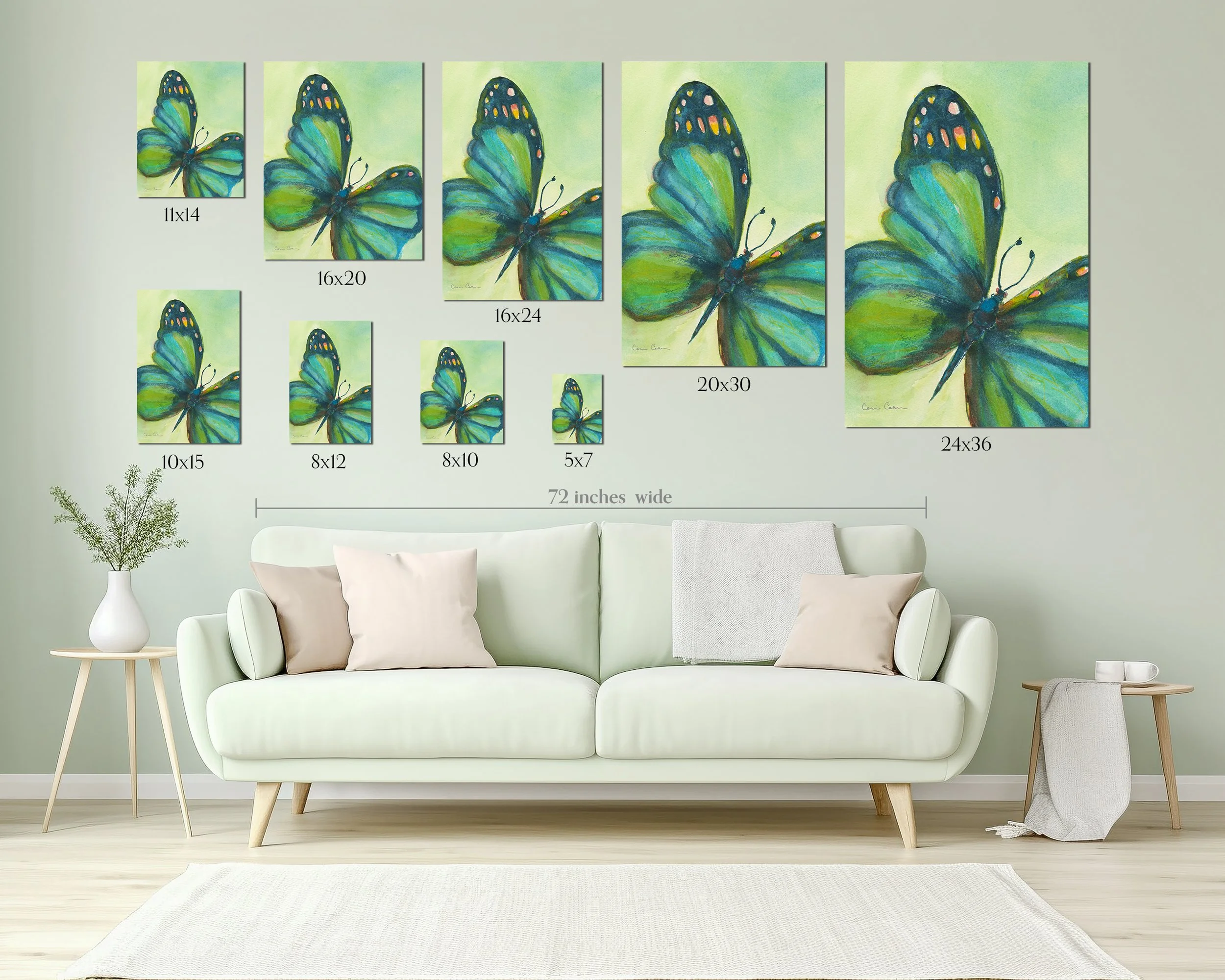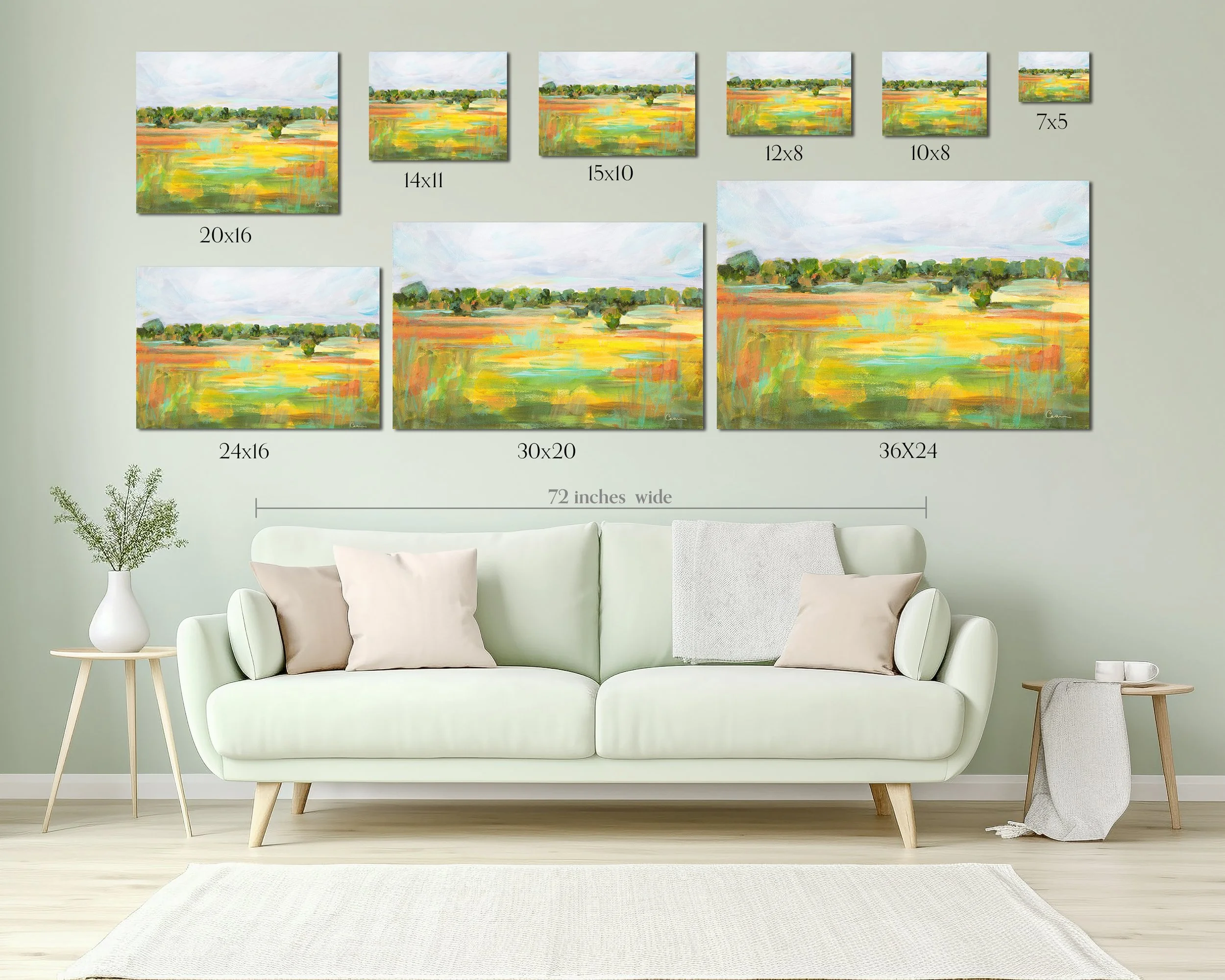 Generally, you can go smaller when including the print in a wall gallery or displaying on a disk, but stand alone prints need to be large enough to fill the space without looking lost. See below for some examples of different print sizes. Hopefully, this will help when comparing sizes and trying to determine the best fit for your space.